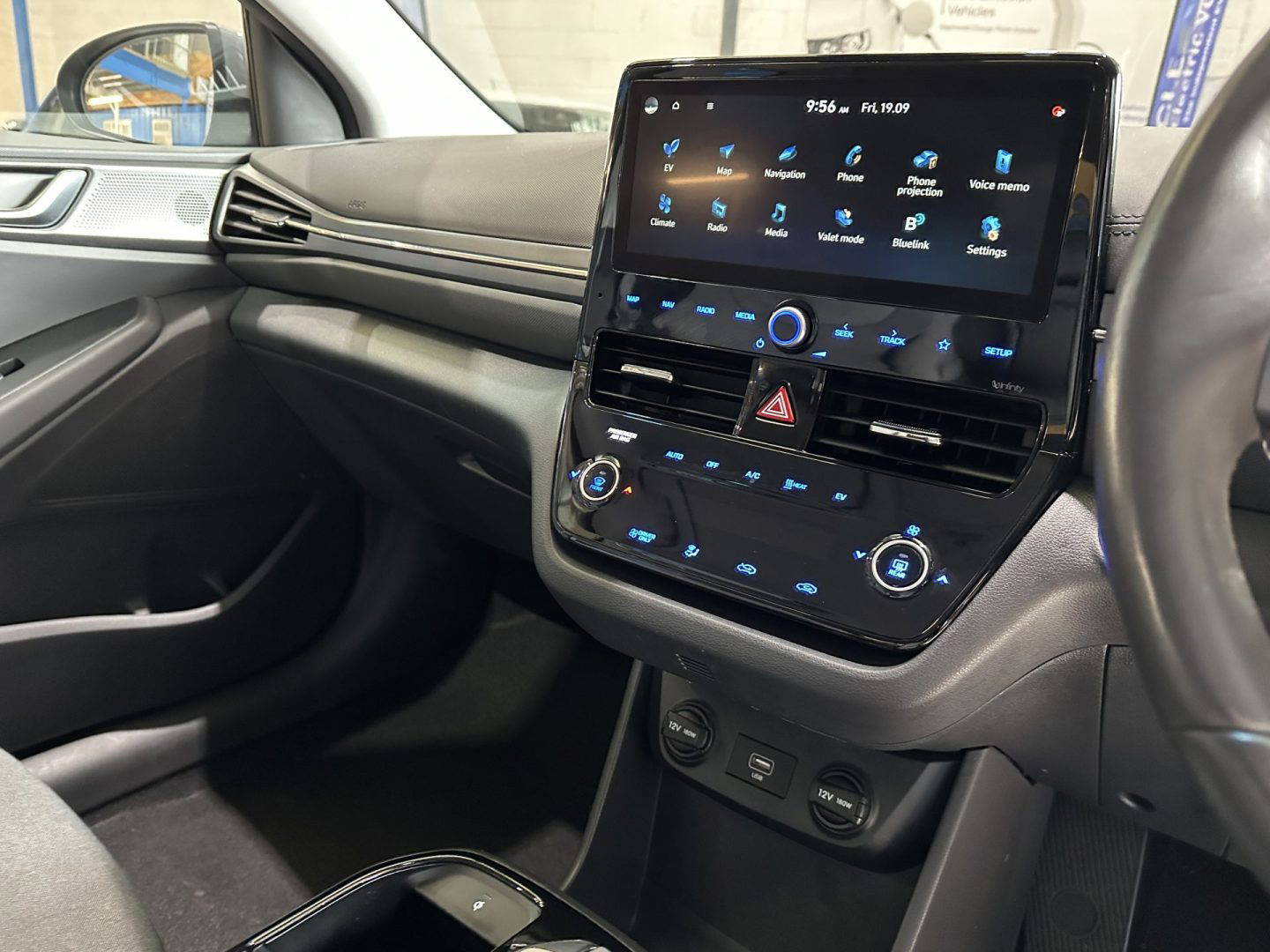 The Hyundai Ioniq is a very efficient car, it come with the following: touchscreen Sat Nav, USB/AUX connections, Bluetooth, upgraded Infinity sound system (1 centre, 2 tweeters, 2 front, 2 rear, 1 subwoofer and 1 ext amp), DAB radio, wireless phone charging pad, lane departure warning system with lane assist, cruise control with stop & go function, TPMS system, 12v power outlet, rear camera with guidance system, rear parking sensors, electric windows, electric folding mirrors, air con, auto dimming rear mirror, rain sensor wipers, heated steering wheel, heated front seats, split folding rear seats โ€“ 60-40, steering wheel audio/phone & cruise controls, 16 inch alloys.