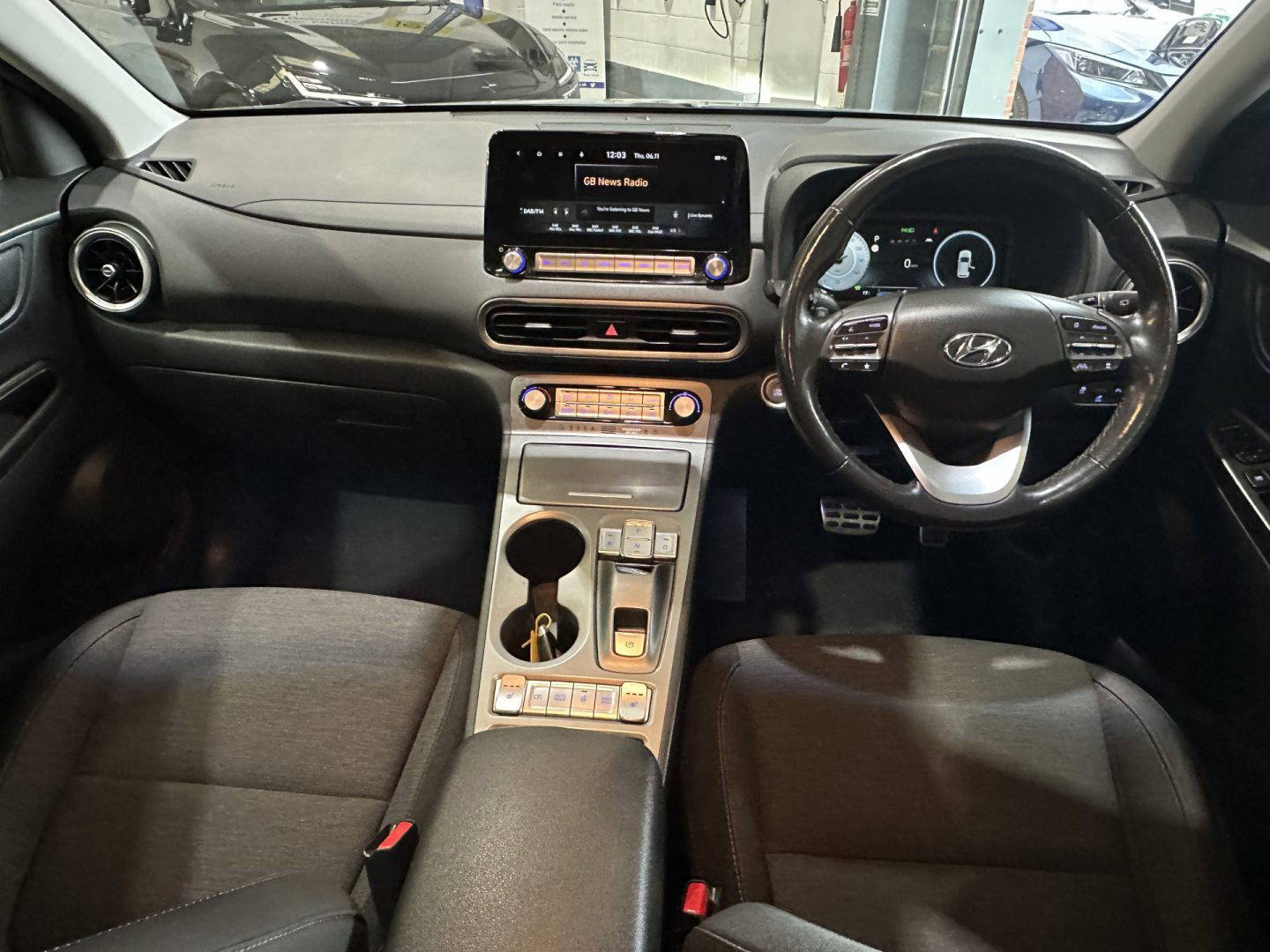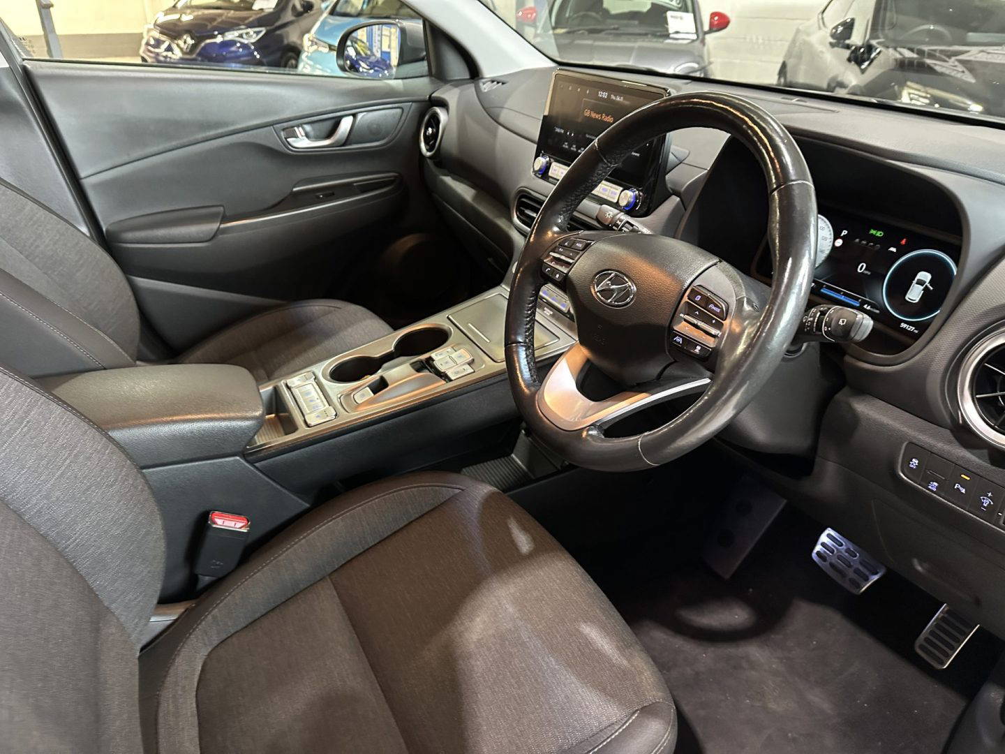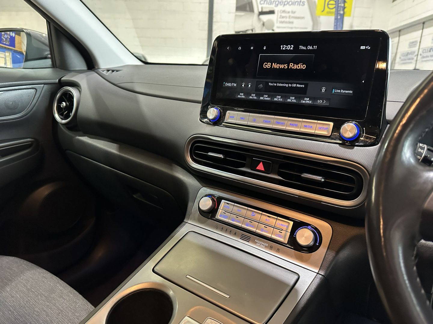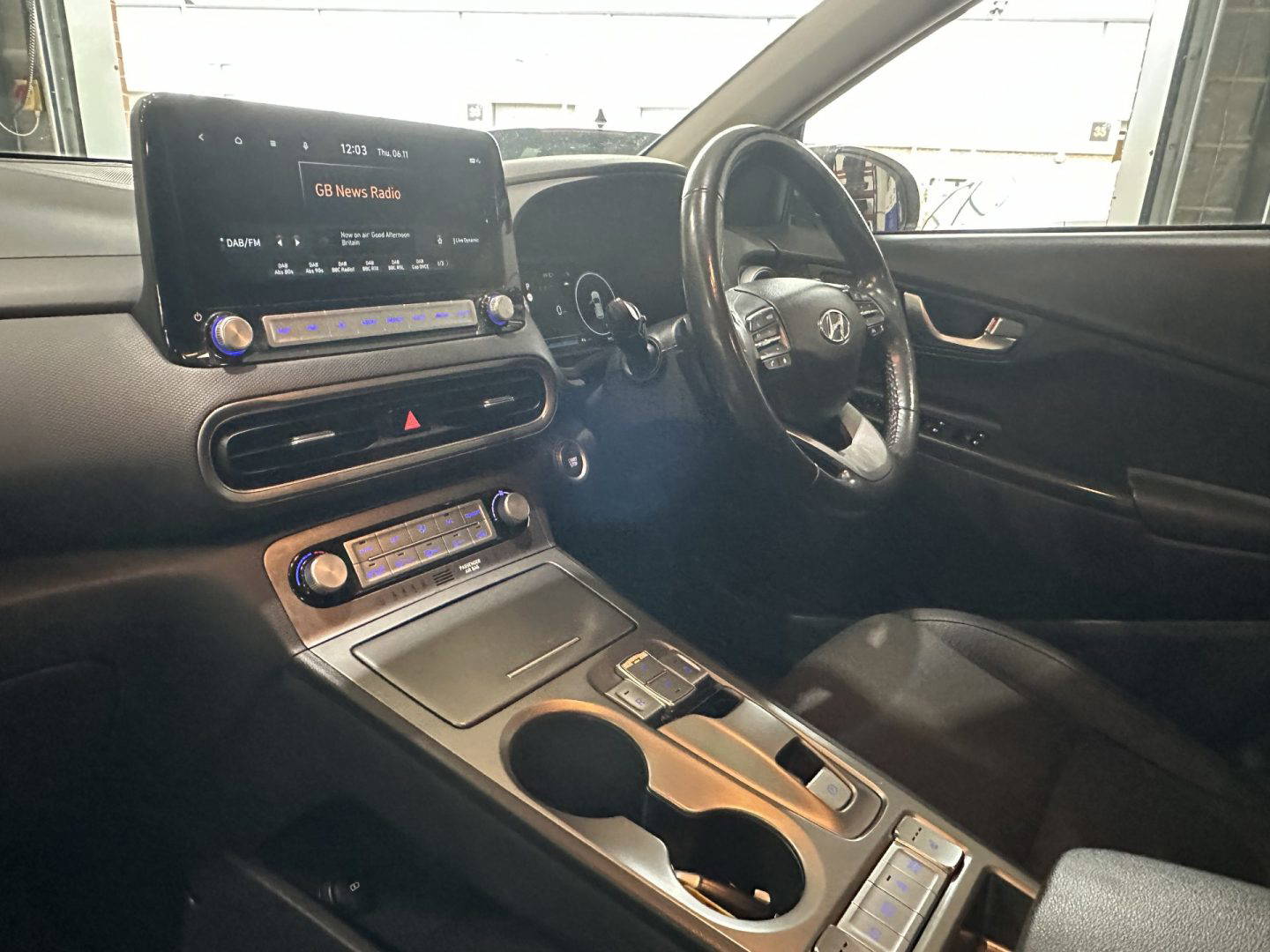 New shape Kona with a cloth interior, DAB radio, 10” widescreen navigation, Apple CarPlay, Android Auto, Bluetooth, Krell premium 8 speaker audio system, wireless phone charging, driver attention warning, front and rear parking sensors, colour reversing camera, 17” alloy wheels, folding mirrors, electric mirrors front and rear, rear privacy glass, heated front seats, heated steering wheel, air con, climate control, battery heater, roof rails, lane assist, auto dimming rear mirror, cruise control with speed limiter, LED daytime running lights, hill start assist control.