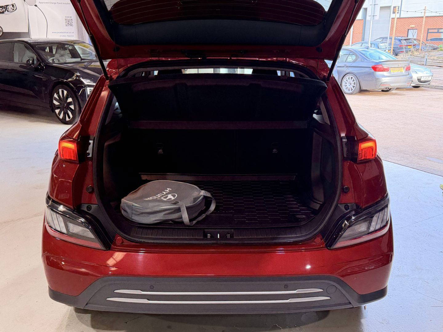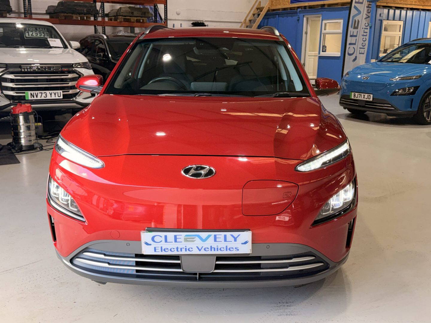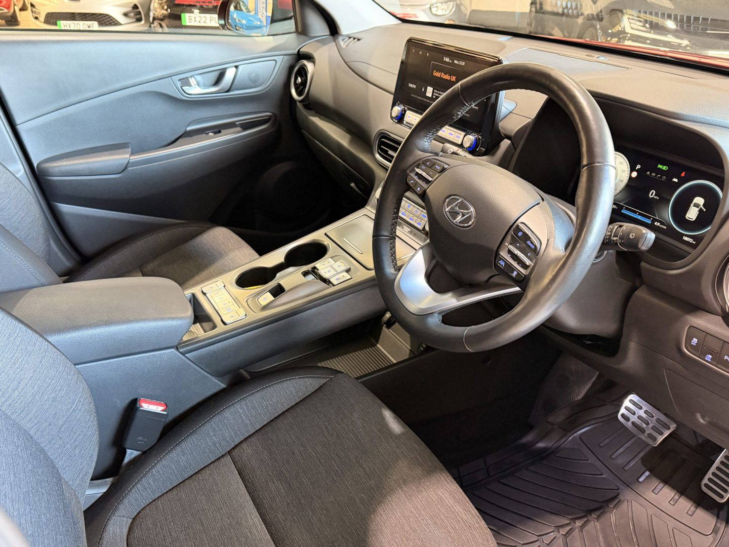 New shape Kona in stunning red. Spec includes a cloth interior, DAB radio, 10” widescreen navigation, Apple CarPlay, Android Auto, Bluetooth, Krell premium 8 speaker audio system, wireless phone charging, driver attention warning, front and rear parking sensors, colour reversing camera, 17” alloy wheels, folding mirrors, electric mirrors front and rear, rear privacy glass, heated front seats, heated steering wheel, air con, climate control, battery heater, roof rails, lane assist, auto dimming rear mirror, cruise control with speed limiter, LED daytime running lights, hill start assist control.