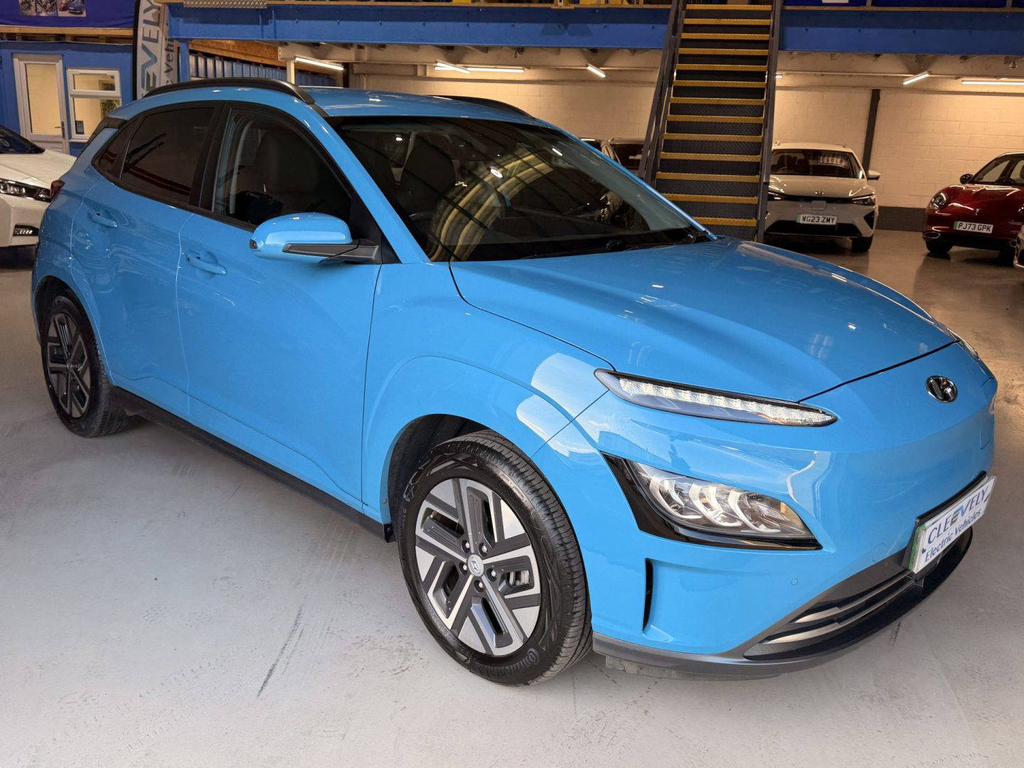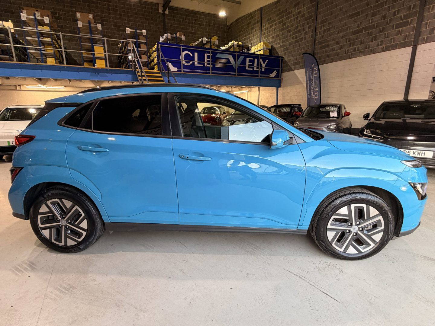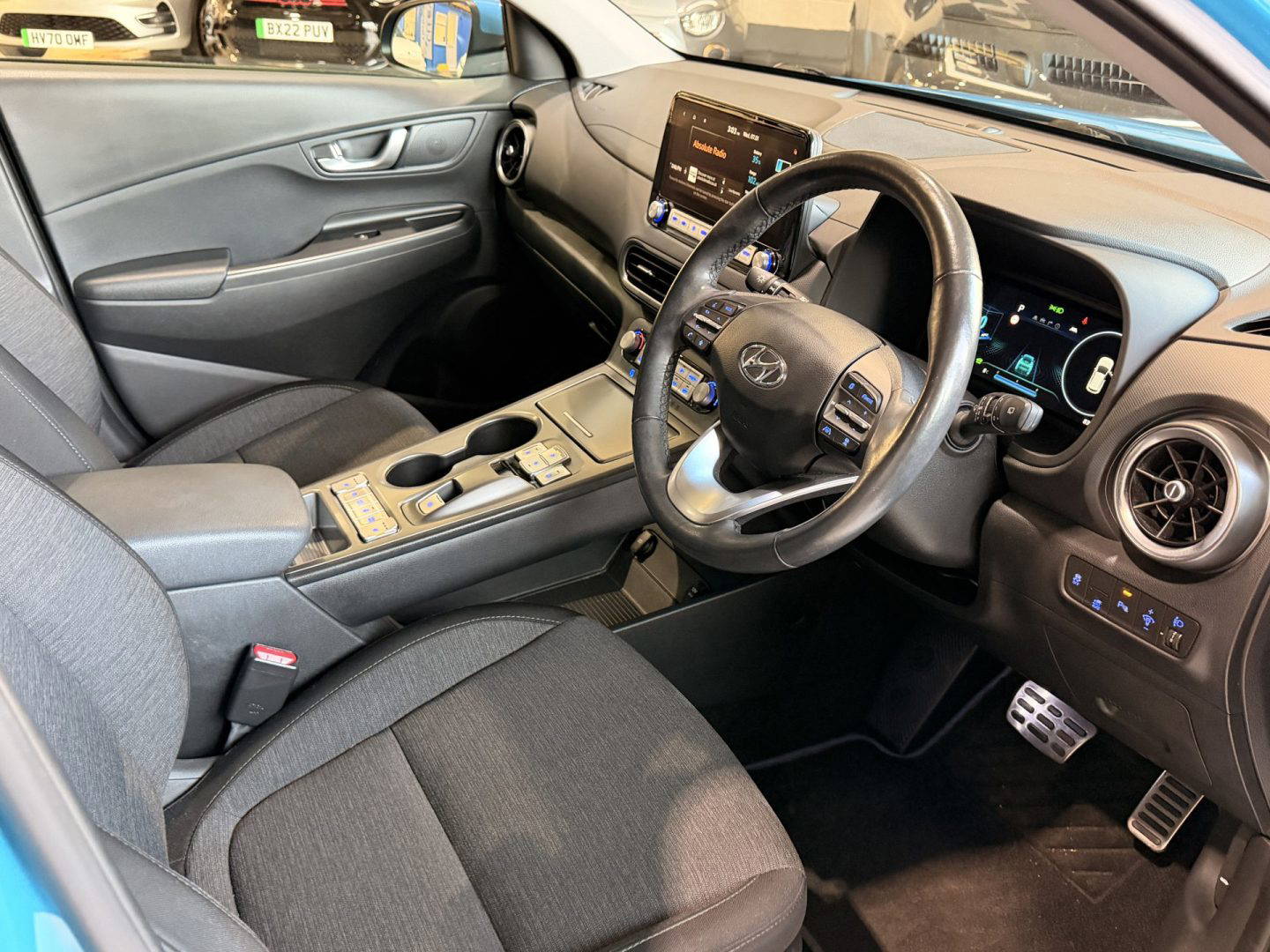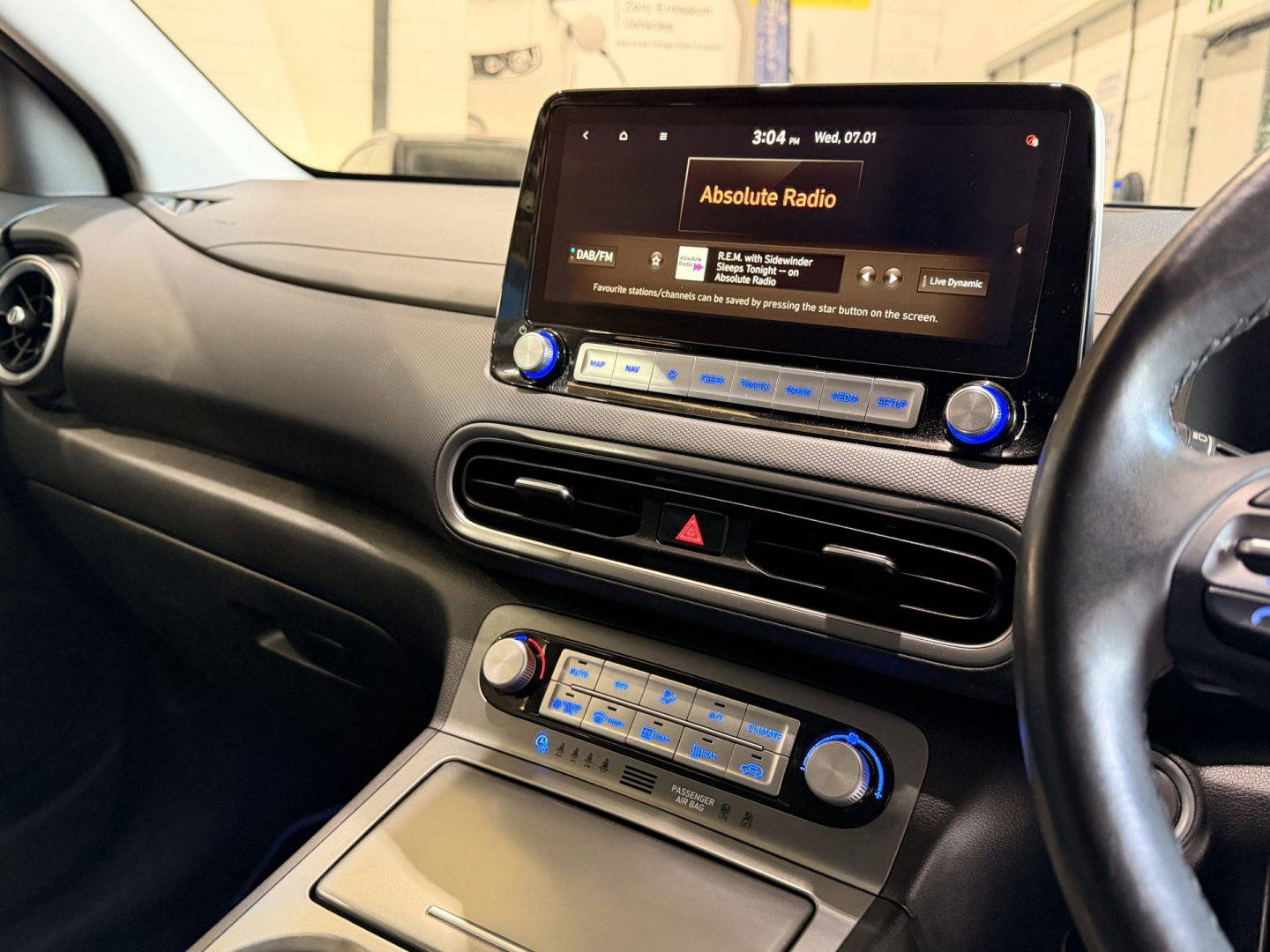 New shape Kona in stunning blue, low mileage. Spec includes a cloth interior, DAB radio, 10” widescreen navigation, Apple CarPlay, Android Auto, Bluetooth, Krell premium 8 speaker audio system, wireless phone charging, driver attention warning, front and rear parking sensors, colour reversing camera, 17” alloy wheels, folding mirrors, electric mirrors front and rear, rear privacy glass, heated front seats, heated steering wheel, air con, climate control, battery heater, roof rails, lane assist, auto dimming rear mirror, cruise control with speed limiter, LED daytime running lights, hill start assist control.