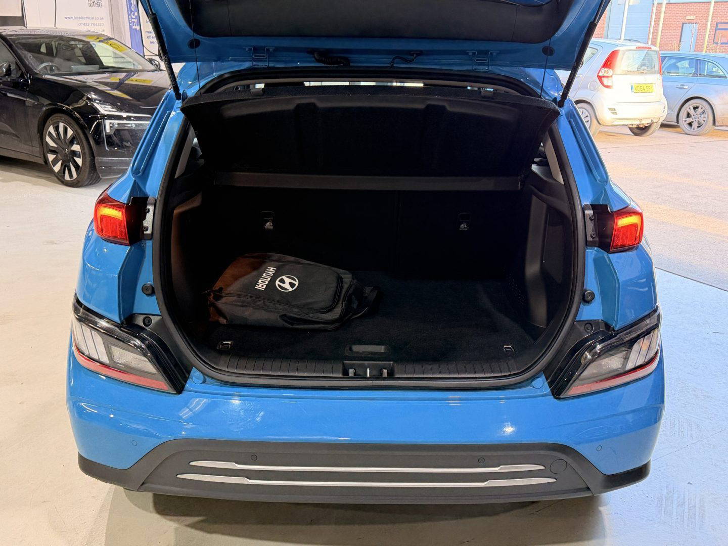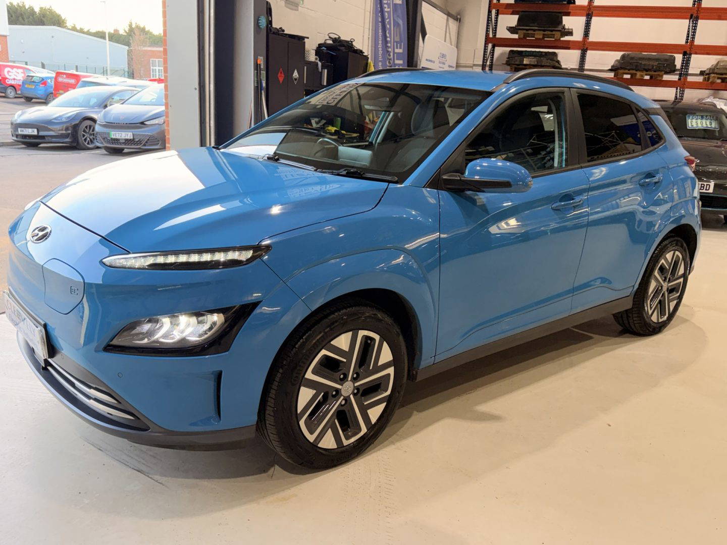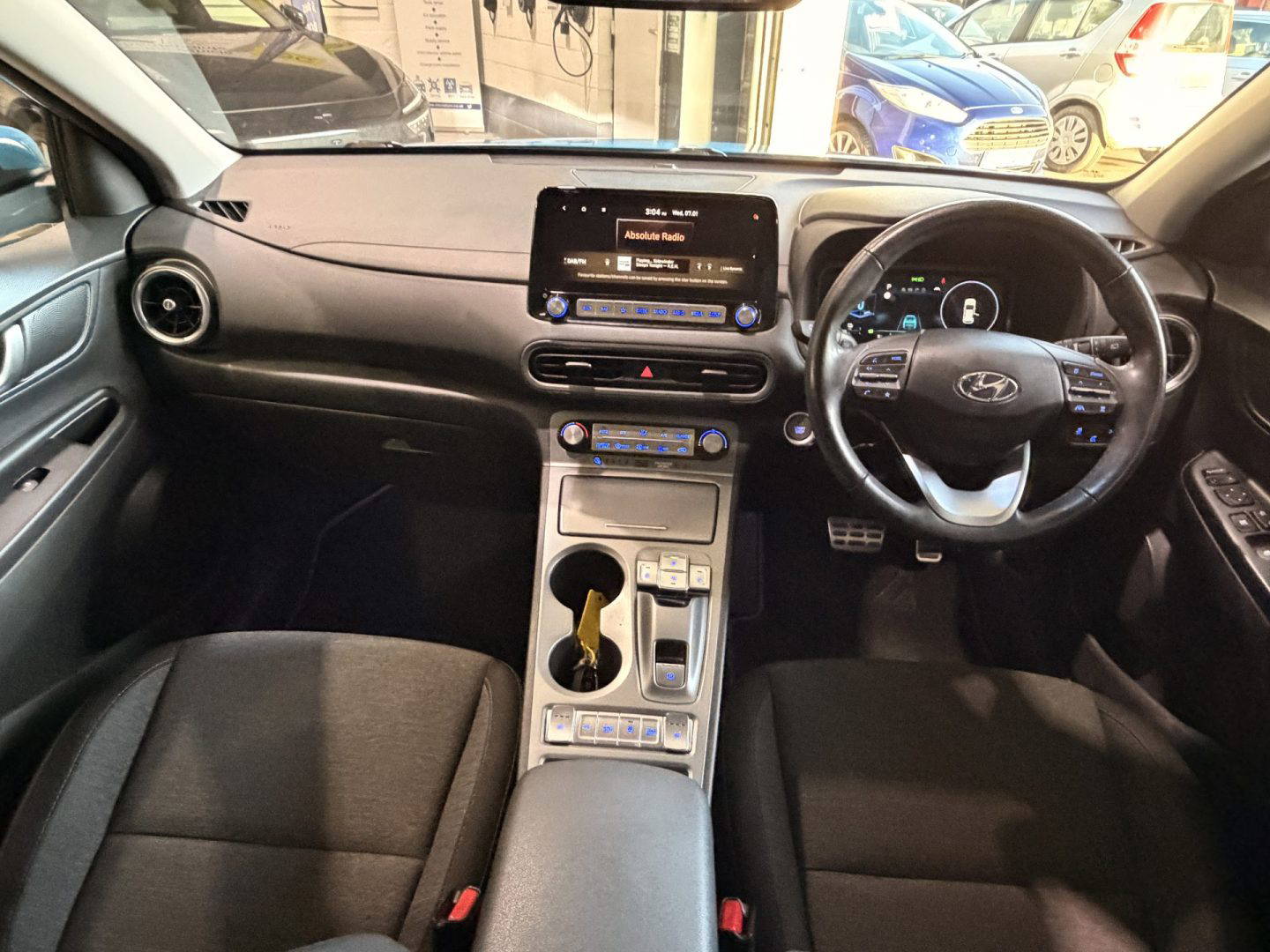New shape Kona in stunning blue, low mileage. Spec includes a cloth interior, DAB radio, 10” widescreen navigation, Apple CarPlay, Android Auto, Bluetooth, Krell premium 8 speaker audio system, wireless phone charging, driver attention warning, front and rear parking sensors, colour reversing camera, 17” alloy wheels, folding mirrors, electric mirrors front and rear, rear privacy glass, heated front seats, heated steering wheel, air con, climate control, battery heater, roof rails, lane assist, auto dimming rear mirror, cruise control with speed limiter, LED daytime running lights, hill start assist control.