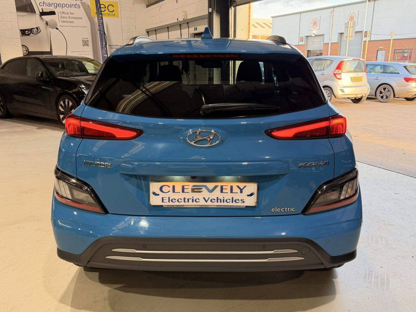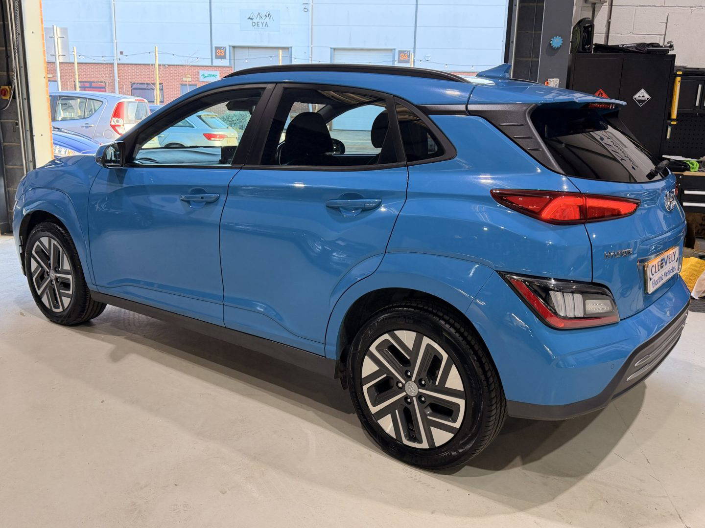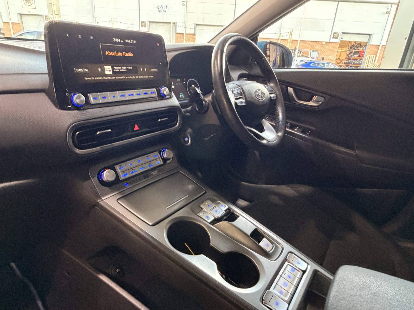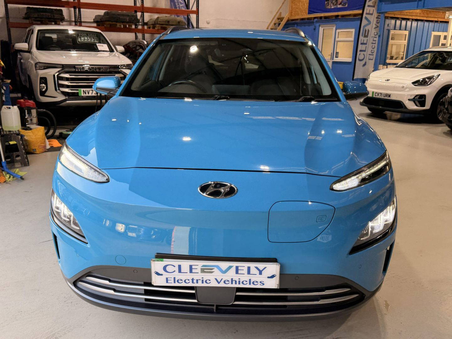 New shape Kona in stunning blue, low mileage. Spec includes a cloth interior, DAB radio, 10” widescreen navigation, Apple CarPlay, Android Auto, Bluetooth, Krell premium 8 speaker audio system, wireless phone charging, driver attention warning, front and rear parking sensors, colour reversing camera, 17” alloy wheels, folding mirrors, electric mirrors front and rear, rear privacy glass, heated front seats, heated steering wheel, air con, climate control, battery heater, roof rails, lane assist, auto dimming rear mirror, cruise control with speed limiter, LED daytime running lights, hill start assist control.