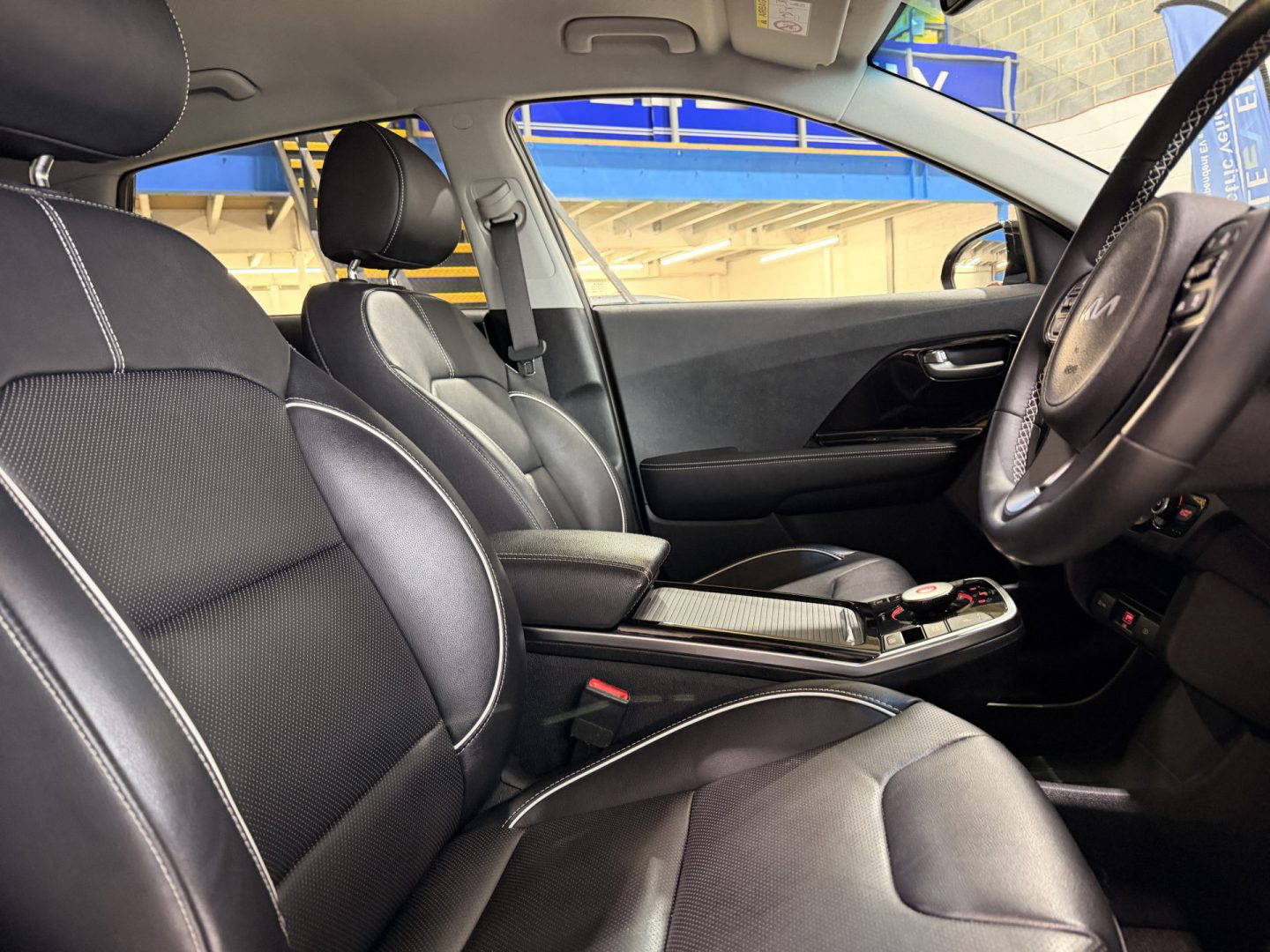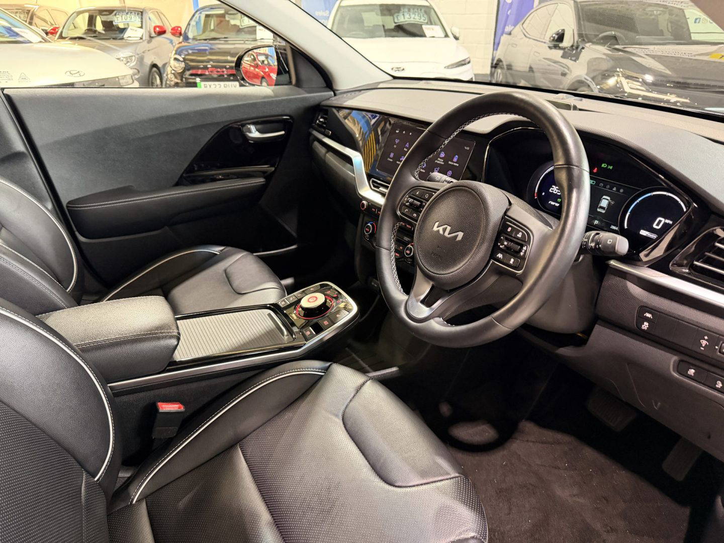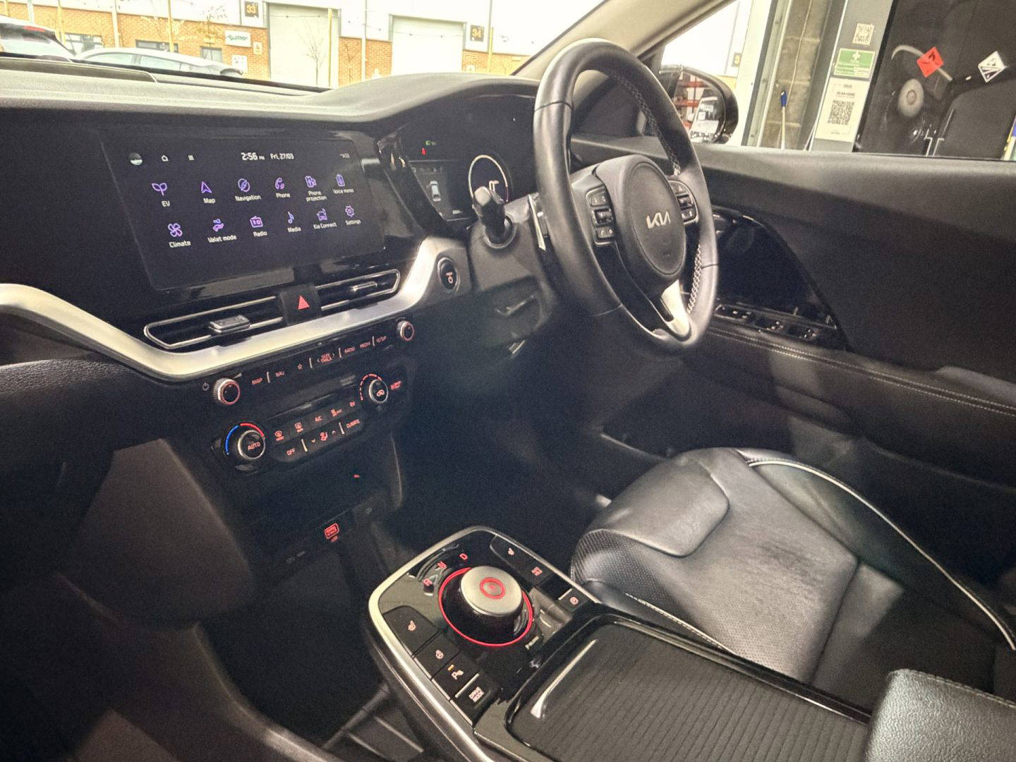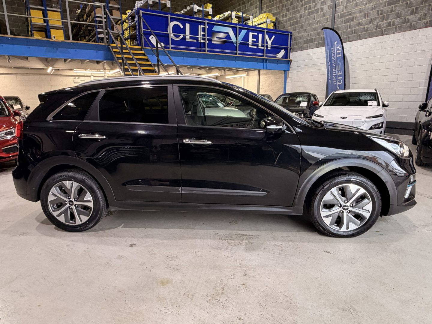 Kia eNiro 3, finished in black. This car comes with the following: 10” touchscreen satnav, DAB radio, 6 speaker sound system, 17” alloy wheels, adaptive smart cruise control, Apple Car Play and Android Auto, wireless phone charging, auto dimming rear mirror, auto headlights, Bluetooth connectivity, heated front seats, heated steering wheel, lane assist, rear privacy glass, front and rear parking sensors, colour reversing camera, electric windows, electric folding wing mirrors, auto dimming rear view mirror, LED daytime running lights, roof rails, rear spoiler, solar glass, shark fin antenna, driver’s seat lumber support, ISOFIX system.