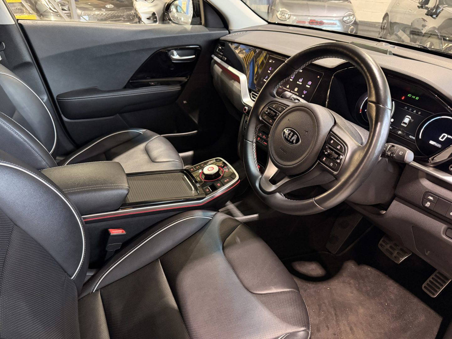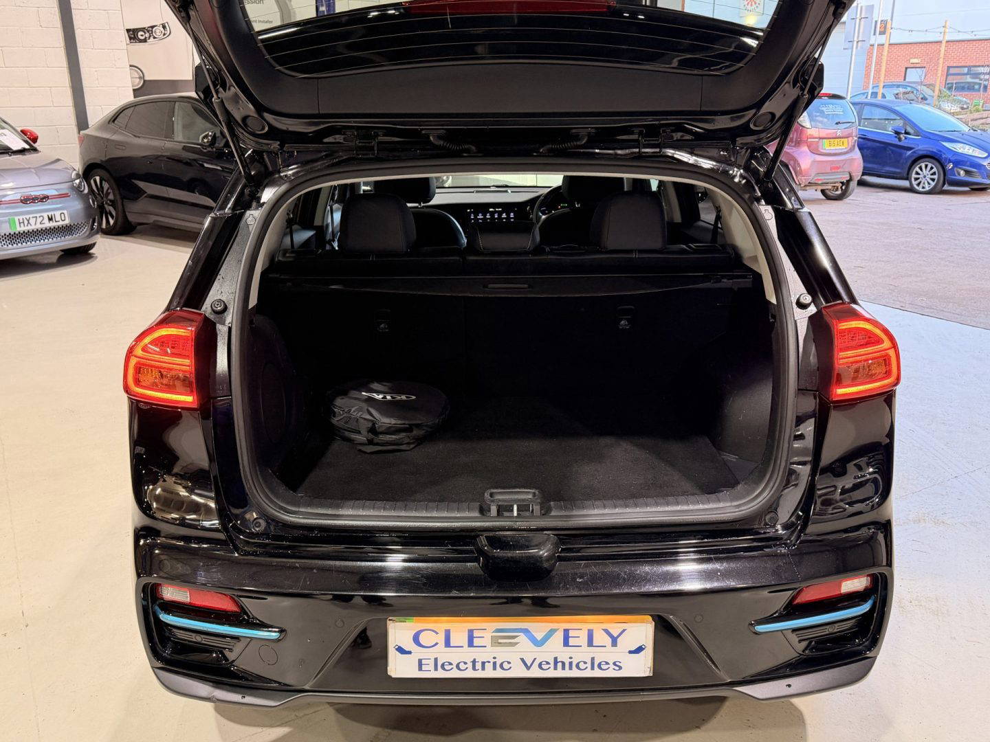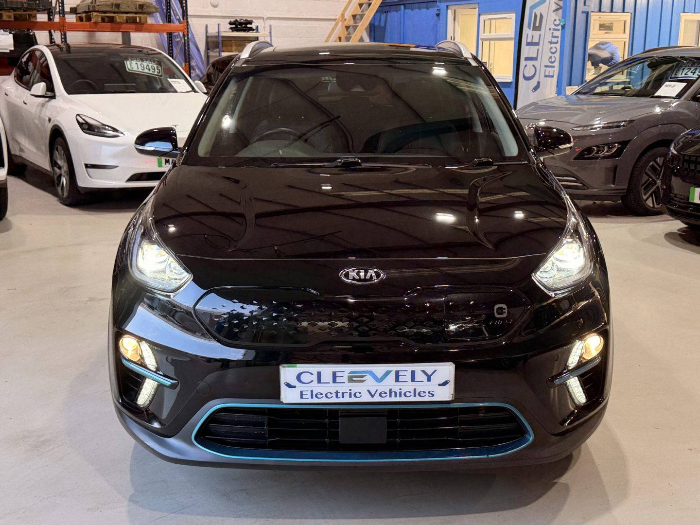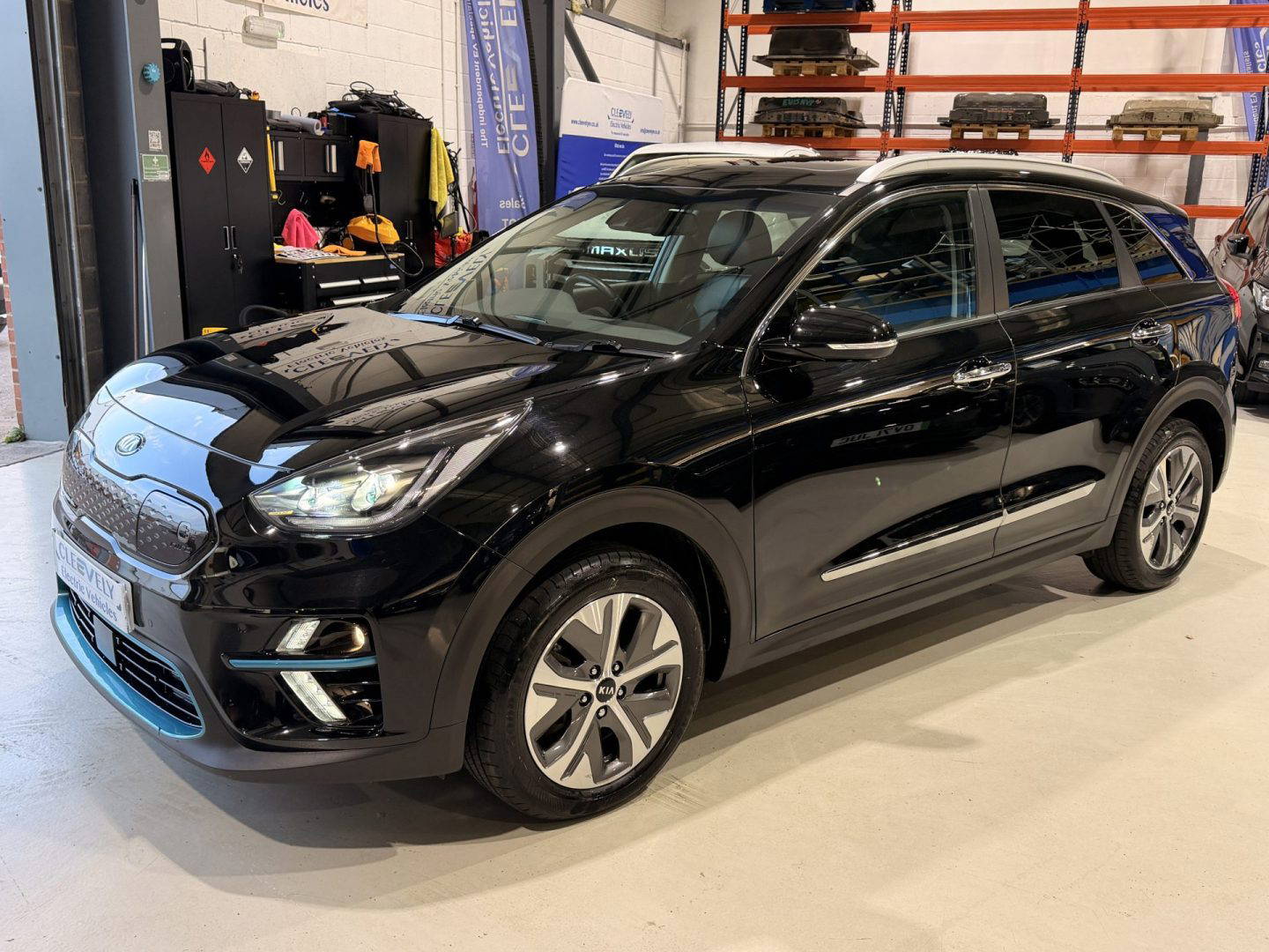 The Kia eNiro is a fantastic car, finished in metallic black. In addition to the normal eNiro spec the 4+ comes with electric sunroof, drivers seat position memory, heated rear seats, cooling front seats, traffic sign recognition allowing display of current speed limit and enabling smart speed control, 3 phase 11kW charging. It also comes with the following: 10” touchscreen satnav, DAB radio, 8 speaker JBL premium sound system with subwoofer, 17” alloy wheels, adaptive smart cruise control, Apple Car Play and Android Auto, wireless phone charging, auto dimming rear mirror, auto headlights, heat pump system, Bluetooth connectivity, heated seats front & rear, heated steering wheel, cooling front seats, lane assist, rear privacy glass, front and rear parking sensors, colour reversing camera, electric windows, electric folding wing mirrors, LED headlights, roof rails, shark fin antenna, ISOFIX system.