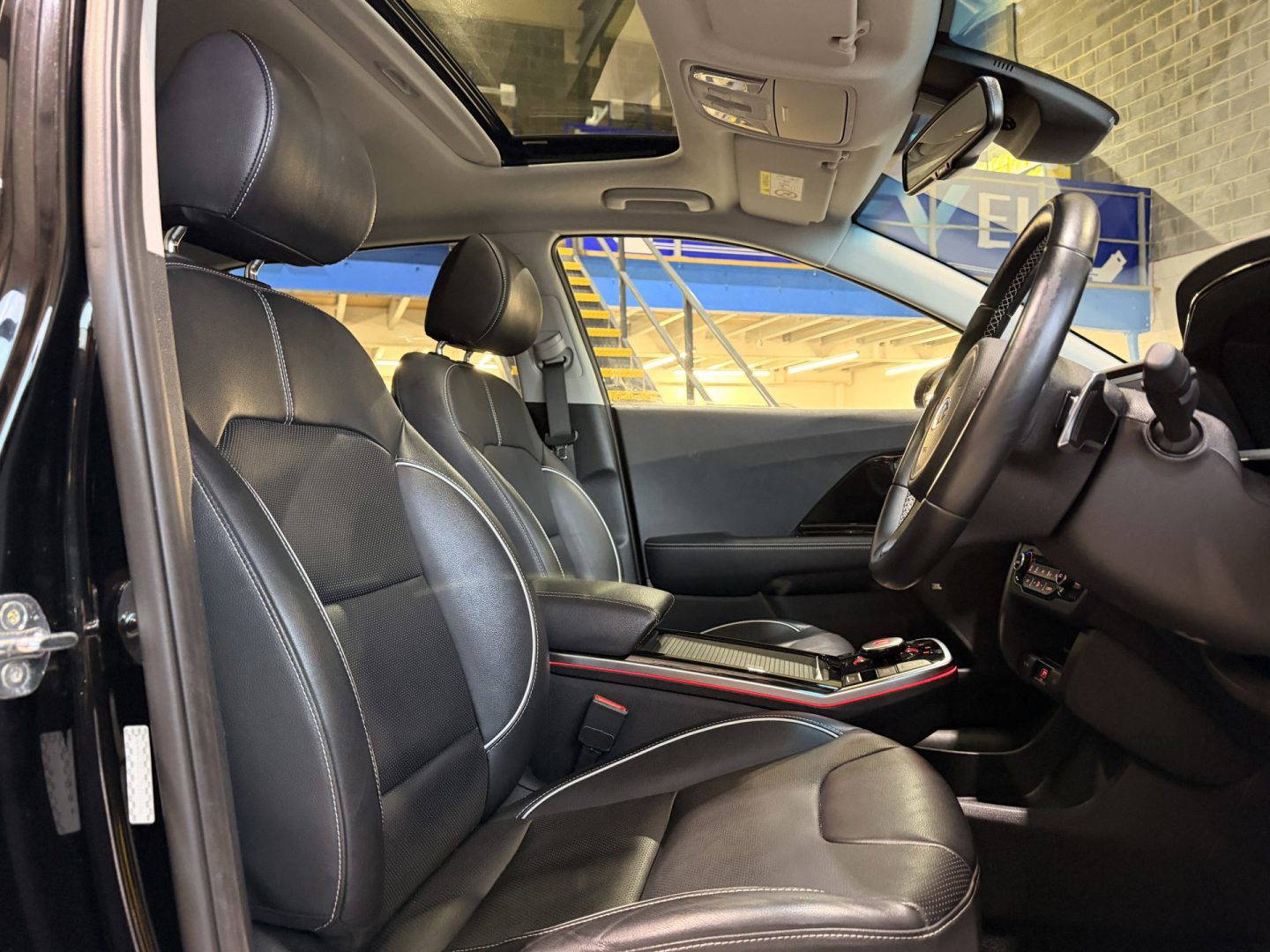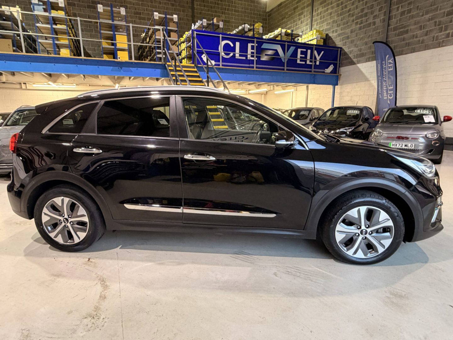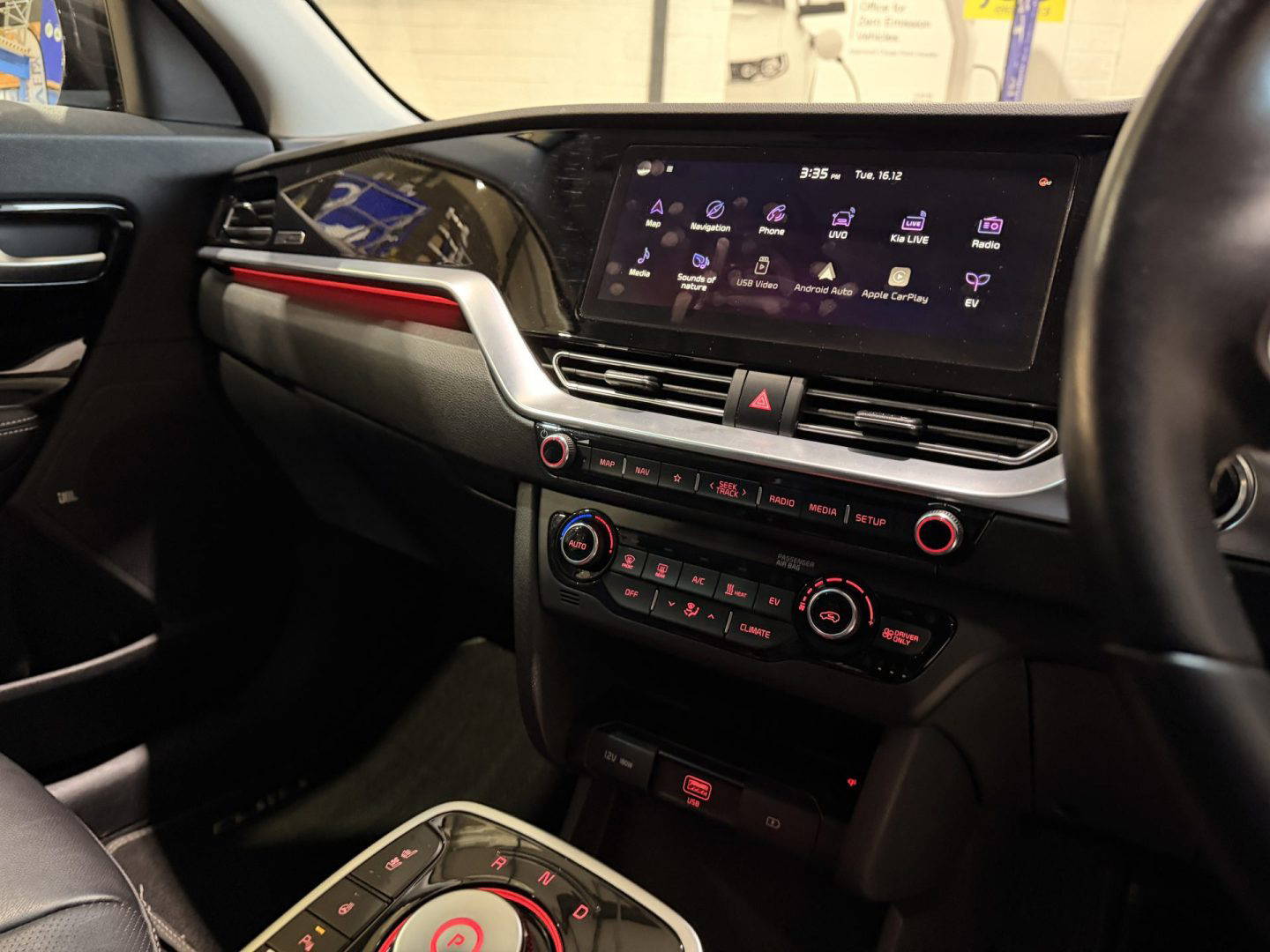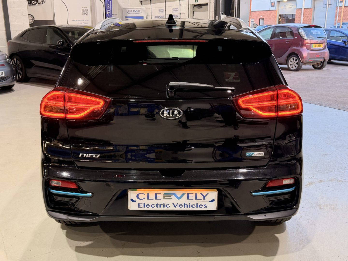 The Kia eNiro is a fantastic car, finished in metallic black. In addition to the normal eNiro spec the 4+ comes with electric sunroof, drivers seat position memory, heated rear seats, cooling front seats, traffic sign recognition allowing display of current speed limit and enabling smart speed control, 3 phase 11kW charging. It also comes with the following: 10” touchscreen satnav, DAB radio, 8 speaker JBL premium sound system with subwoofer, 17” alloy wheels, adaptive smart cruise control, Apple Car Play and Android Auto, wireless phone charging, auto dimming rear mirror, auto headlights, heat pump system, Bluetooth connectivity, heated seats front & rear, heated steering wheel, cooling front seats, lane assist, rear privacy glass, front and rear parking sensors, colour reversing camera, electric windows, electric folding wing mirrors, LED headlights, roof rails, shark fin antenna, ISOFIX system.