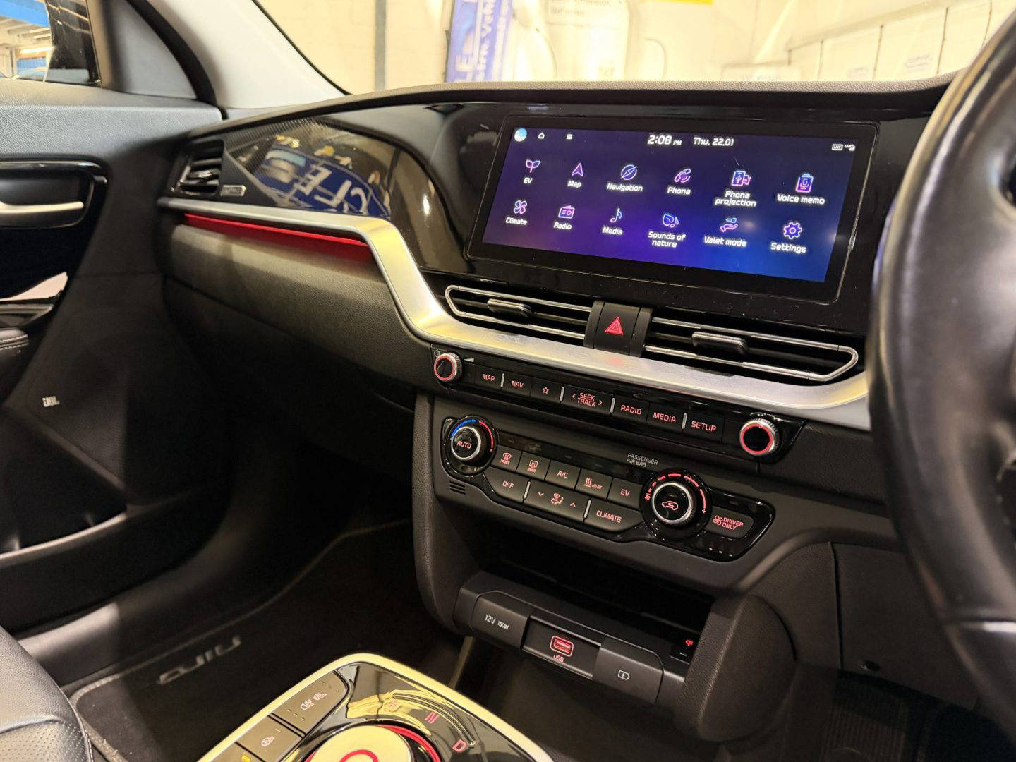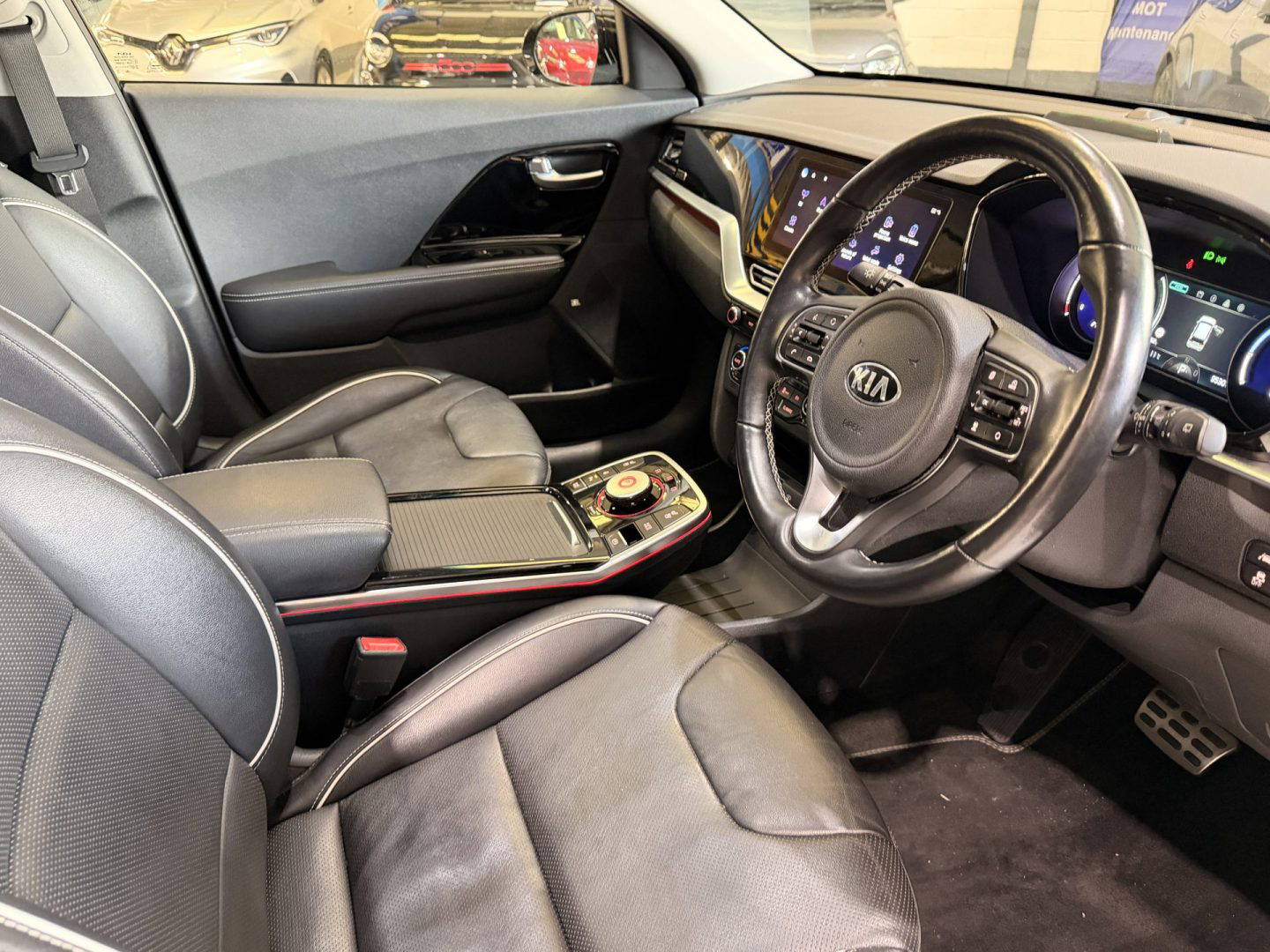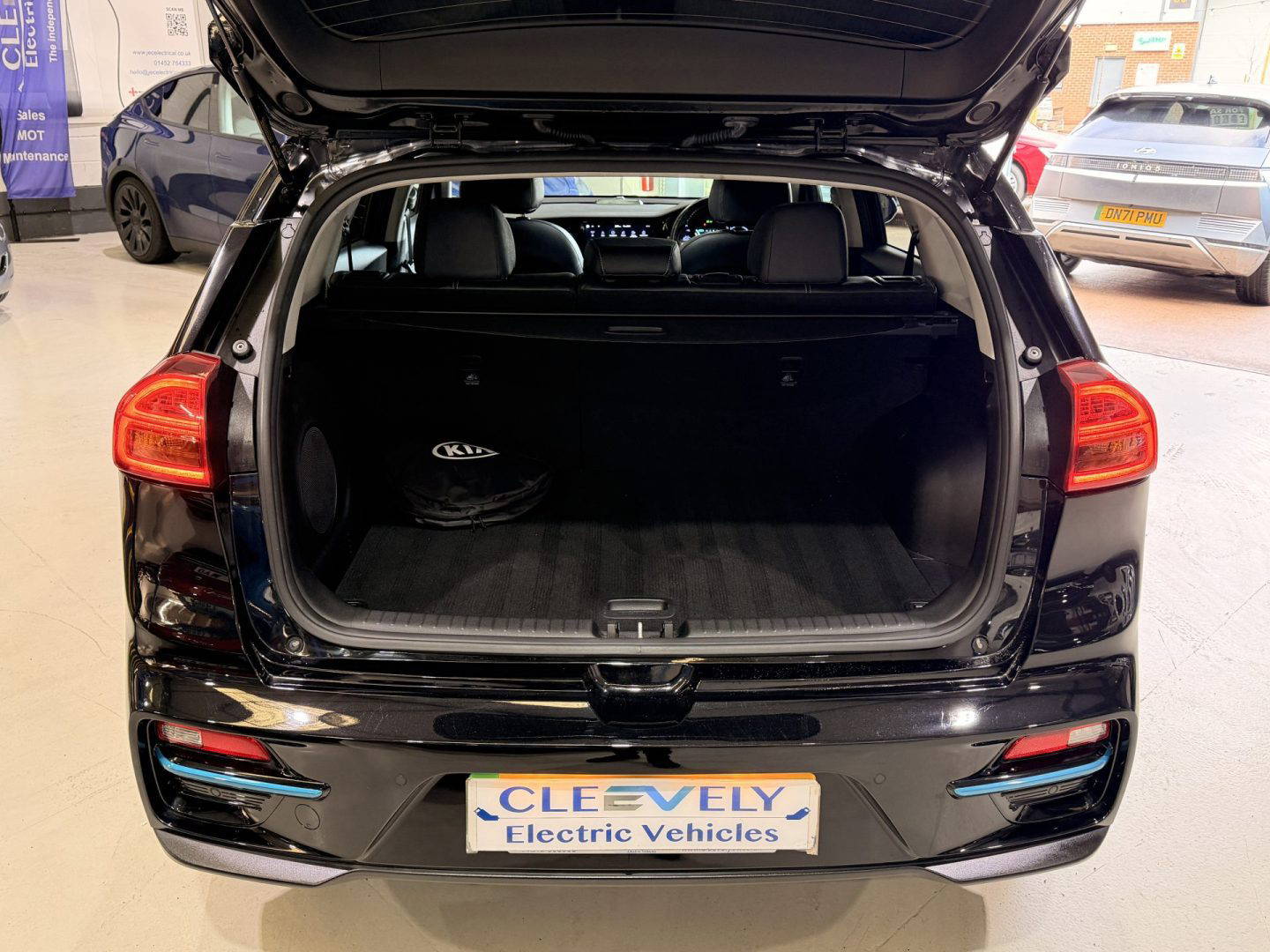 The Kia eNiro is a fantastic car, finished in metallic black. In addition to the normal eNiro spec the 4+ comes with electric sunroof, drivers seat position memory, heated rear seats, cooling front seats, traffic sign recognition allowing display of current speed limit and enabling smart speed control, 3 phase 11kW charging. It also comes with the following: 10” touchscreen satnav, DAB radio, 8 speaker JBL premium sound system with subwoofer, 17” alloy wheels, adaptive smart cruise control, Apple Car Play and Android Auto, wireless phone charging, auto dimming rear mirror, auto headlights, heat pump system, Bluetooth connectivity, heated seats front & rear, heated steering wheel, cooling front seats, lane assist, rear privacy glass, front and rear parking sensors, colour reversing camera, electric windows, electric folding wing mirrors, LED headlights, roof rails, shark fin antenna, ISOFIX system.
