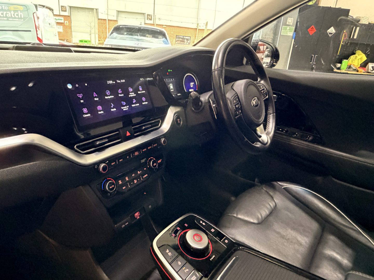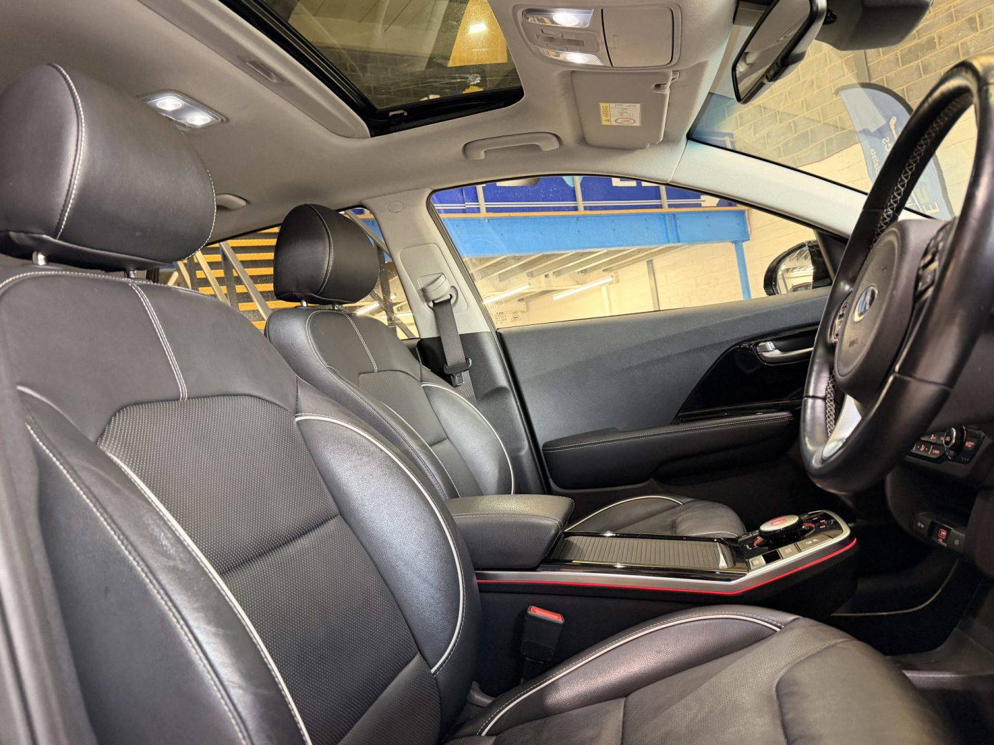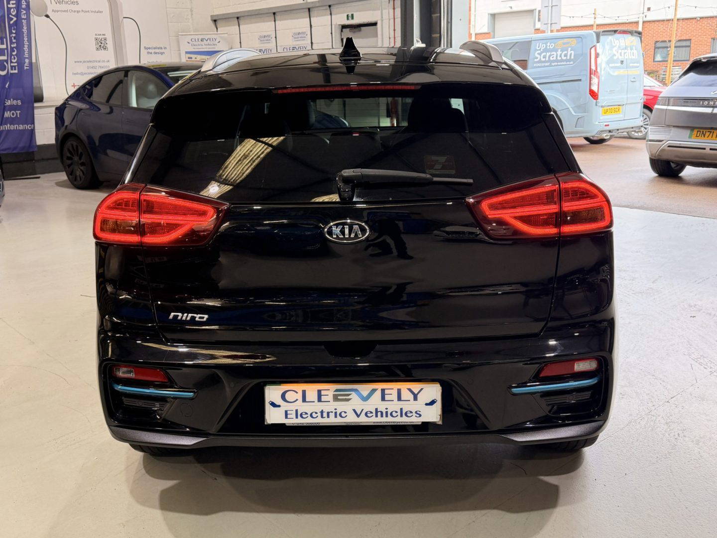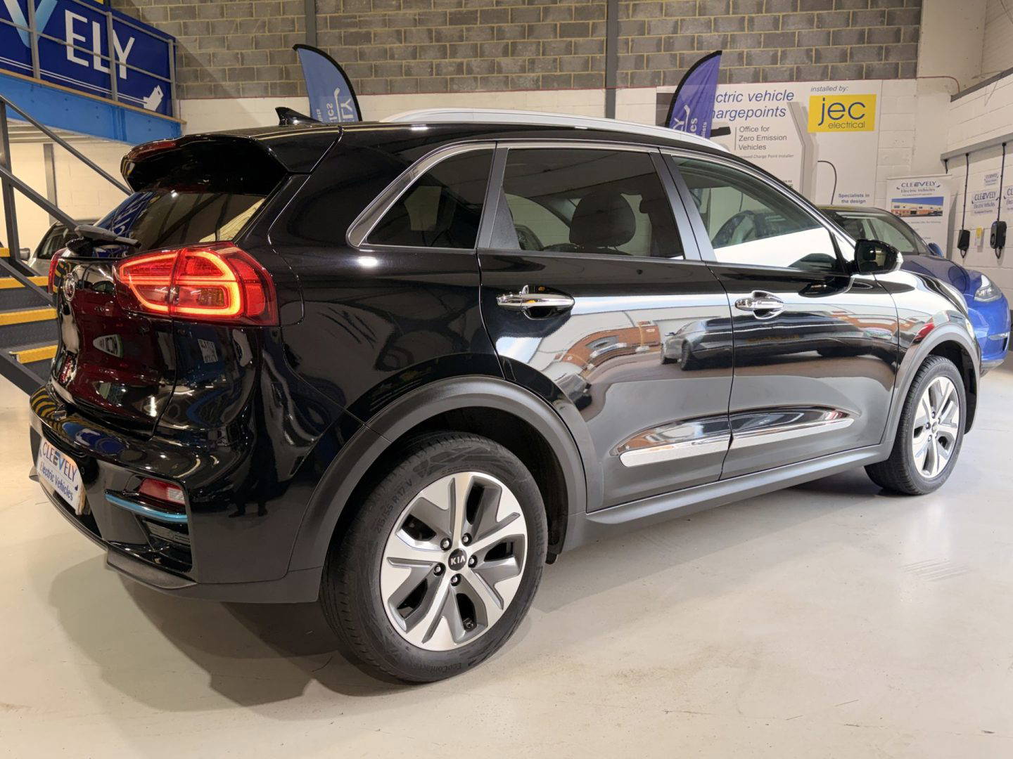 The Kia eNiro is a fantastic car, finished in metallic black. In addition to the normal eNiro spec the 4+ comes with electric sunroof, drivers seat position memory, heated rear seats, cooling front seats, traffic sign recognition allowing display of current speed limit and enabling smart speed control, 3 phase 11kW charging. It also comes with the following: 10” touchscreen satnav, DAB radio, 8 speaker JBL premium sound system with subwoofer, 17” alloy wheels, adaptive smart cruise control, Apple Car Play and Android Auto, wireless phone charging, auto dimming rear mirror, auto headlights, heat pump system, Bluetooth connectivity, heated seats front & rear, heated steering wheel, cooling front seats, lane assist, rear privacy glass, front and rear parking sensors, colour reversing camera, electric windows, electric folding wing mirrors, LED headlights, roof rails, shark fin antenna, ISOFIX system.