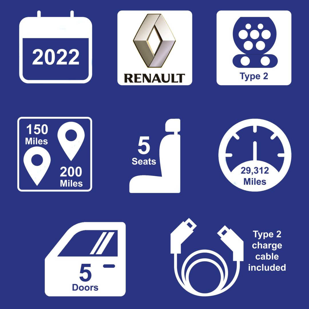 Range 160-200+ miles range. Type 2 charging cable included in sale. Power BHP: 107 BHP | Cargo: 338L | Drivetrain: Front Wheel | Top Speed: 87 MPH Full service history. 2x Keys.