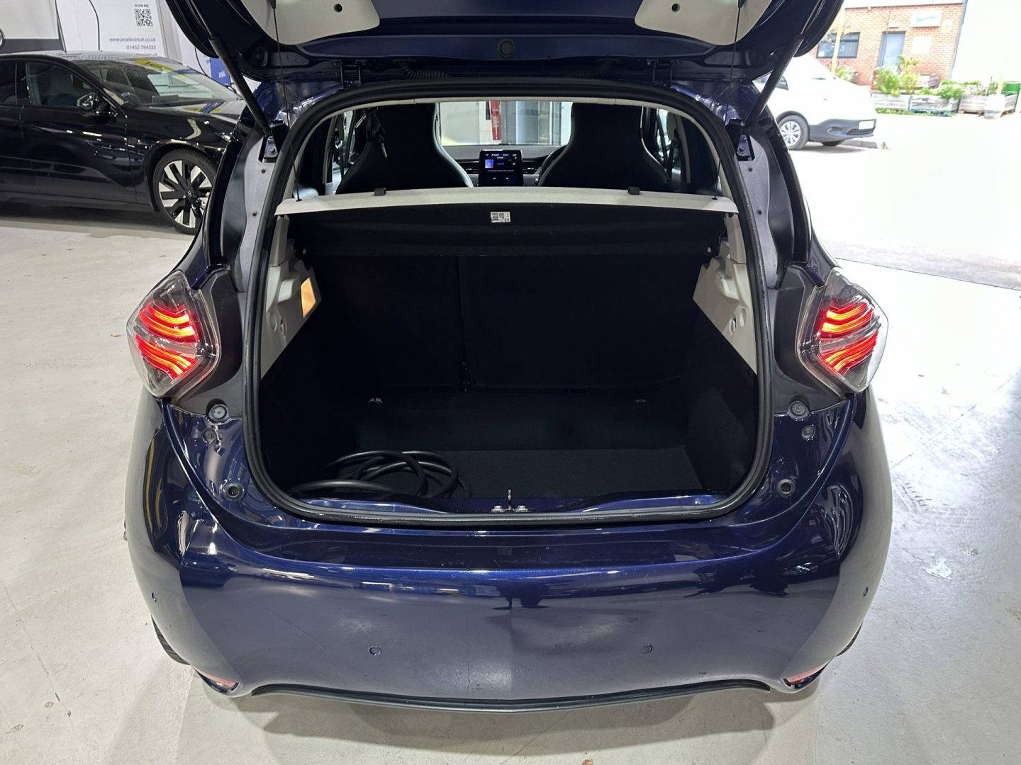 Renault Zoe GT Line Plus finished in metallic blue, with part leather part cloth seats, electric widows, electric folding wing mirrors, 10” TFT colour screen, DAB radio, 6x speakers, parking sensors front and rear, colour reversing camera, heated front seats, heated steering wheel, sat nav, cruise control and speed limiter, lane departure warning, blind spot warning, Eco mode, USB sockets including rear, auto wipers, auto dimming rear view mirror, air con, soft touch steering wheel, split rear seats, 16” alloy wheels, tinted rear windows. Comes with CCS for rapid charging.