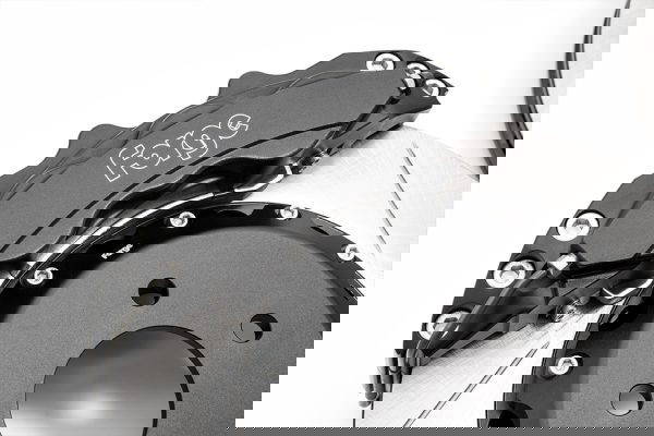 The discs of this big brake kit are grooved to remove braking residue and maintain optimum performance. Included in the kit are braided brake hoses, mountings, and brake pads.