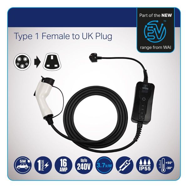 Charge Cable – Type 1 Female To UK Plug – 16A – 5M